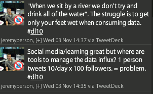 At today’s Dev Learn 10 in San Francisco, I attended a seminar where a woman at the back of the room said “social media is great and all, but I am overwhelmed with the influx of information all around me.” I liked what another person said which was that just because there is lots of data in the world, it doesn’t mean you have to consume everything available to you. The 3-4 minute discussion gave me a lot of ideas, so hopefully you beat me to solving the problem because either way we’ll all win.